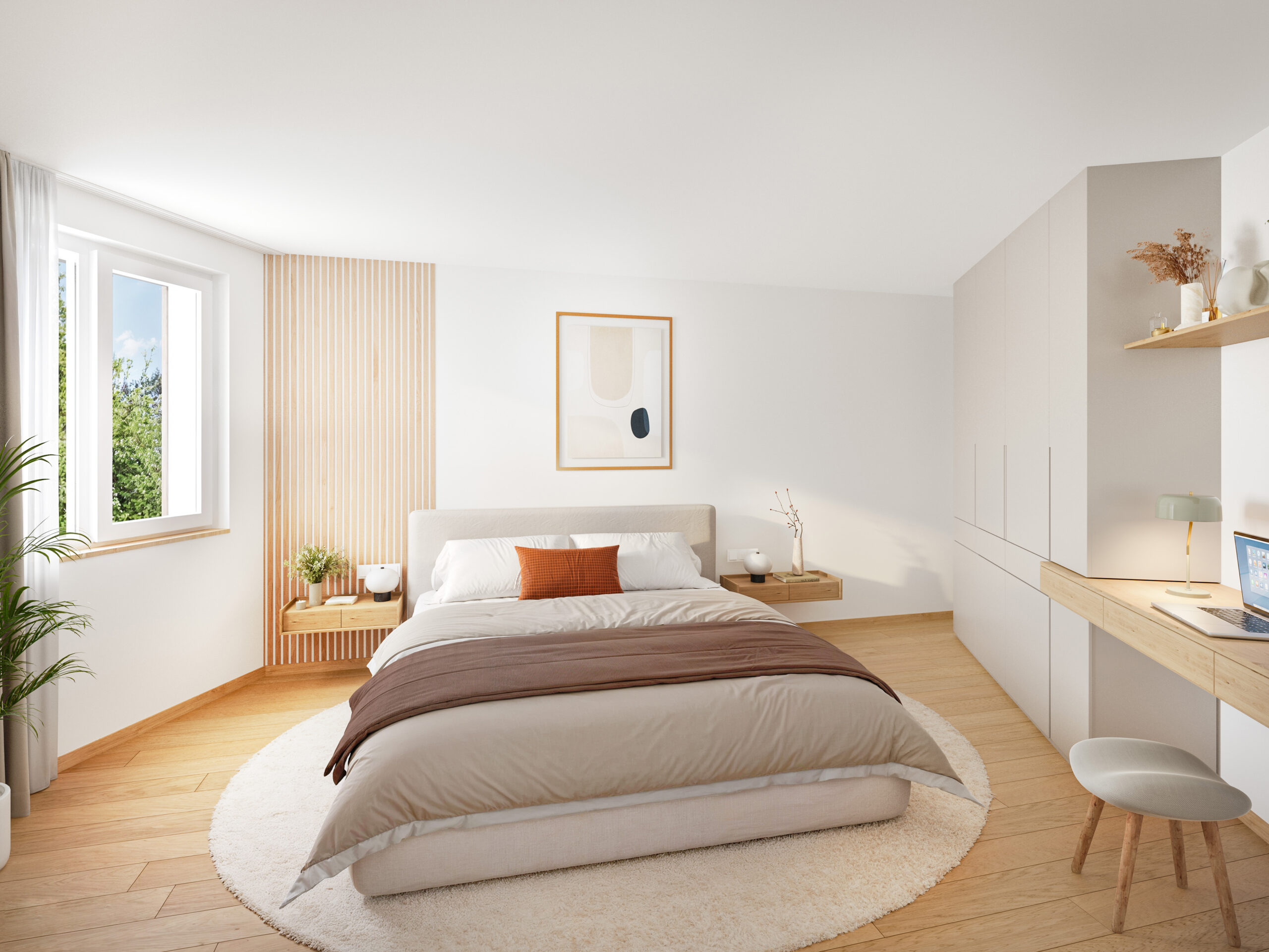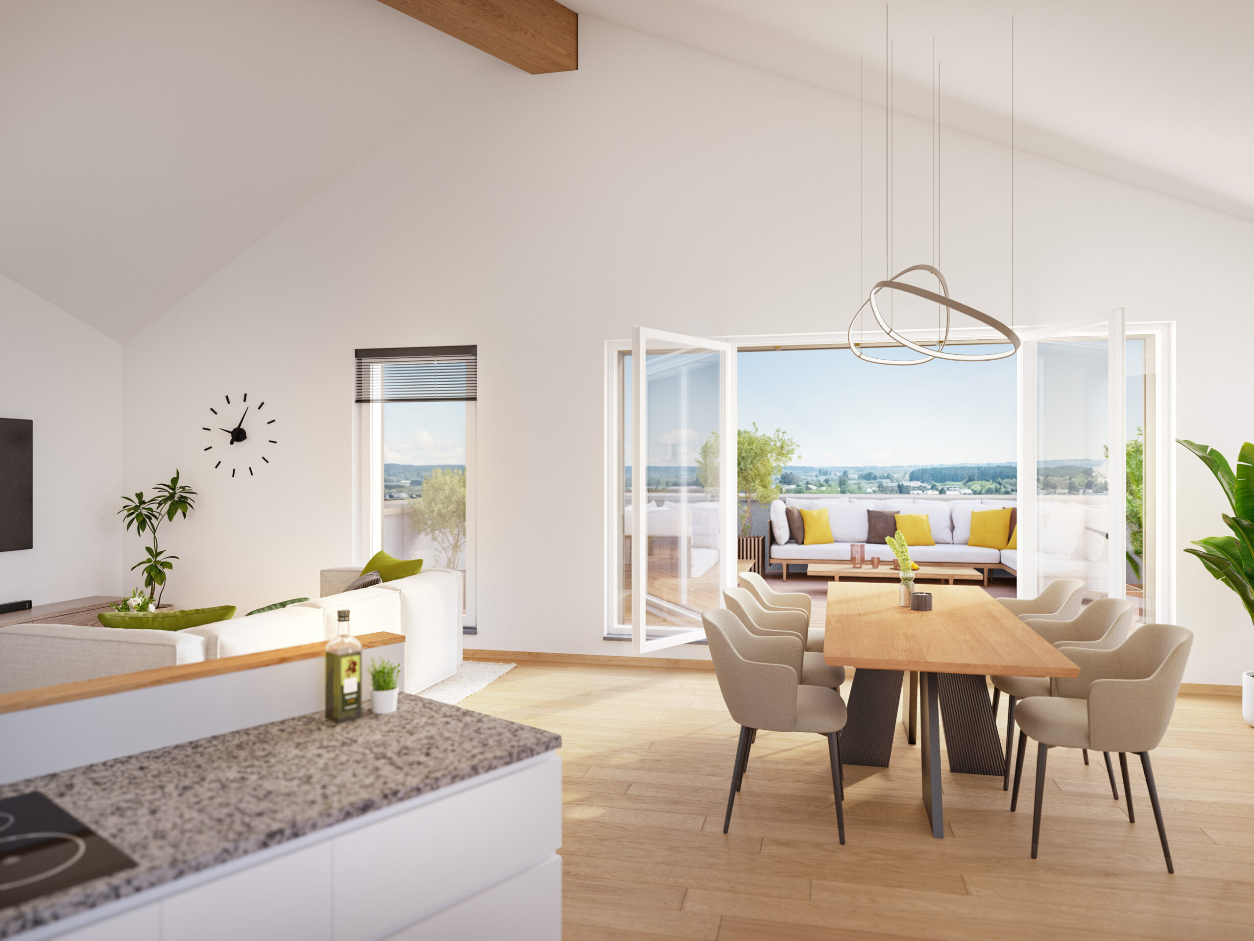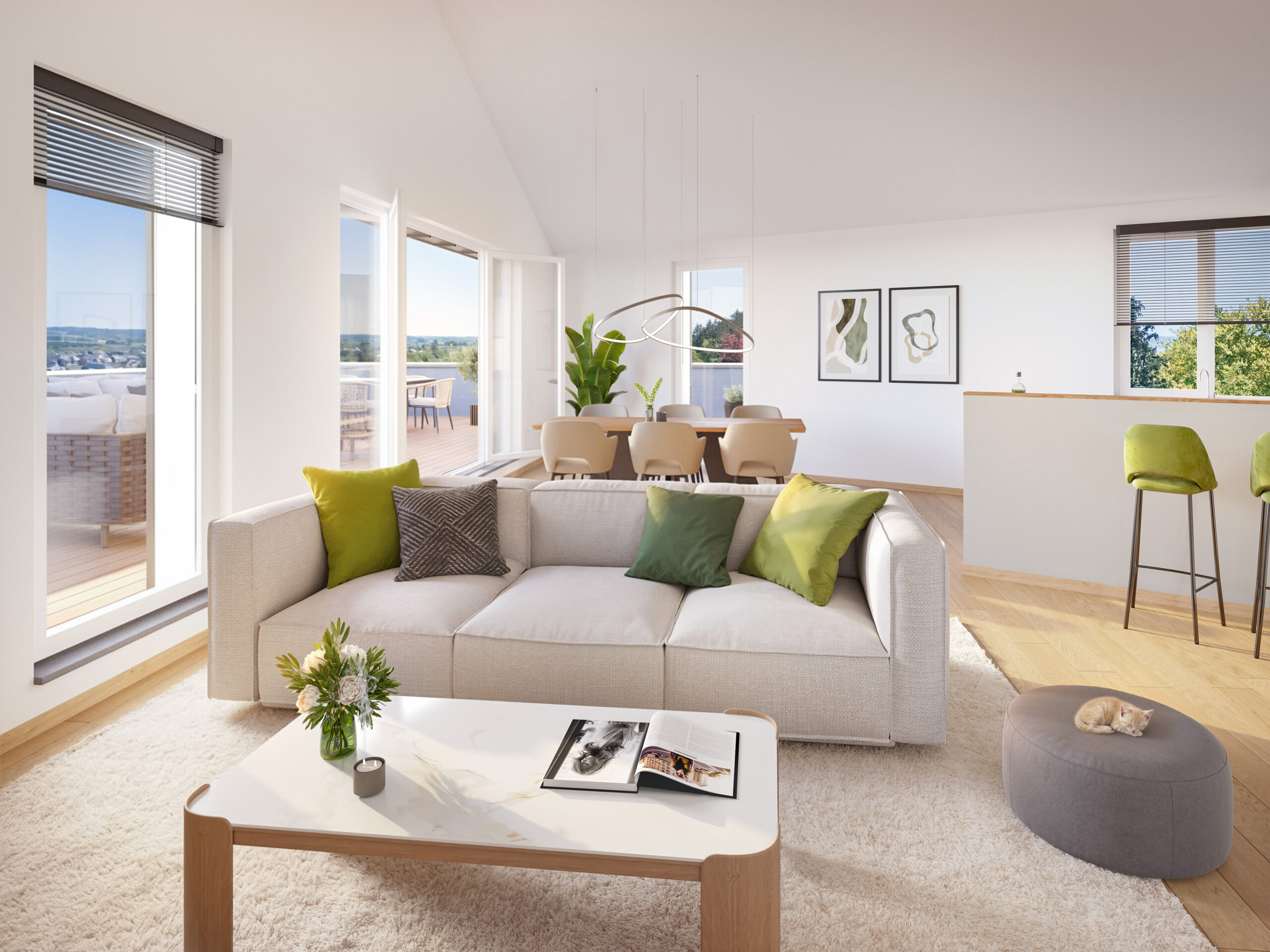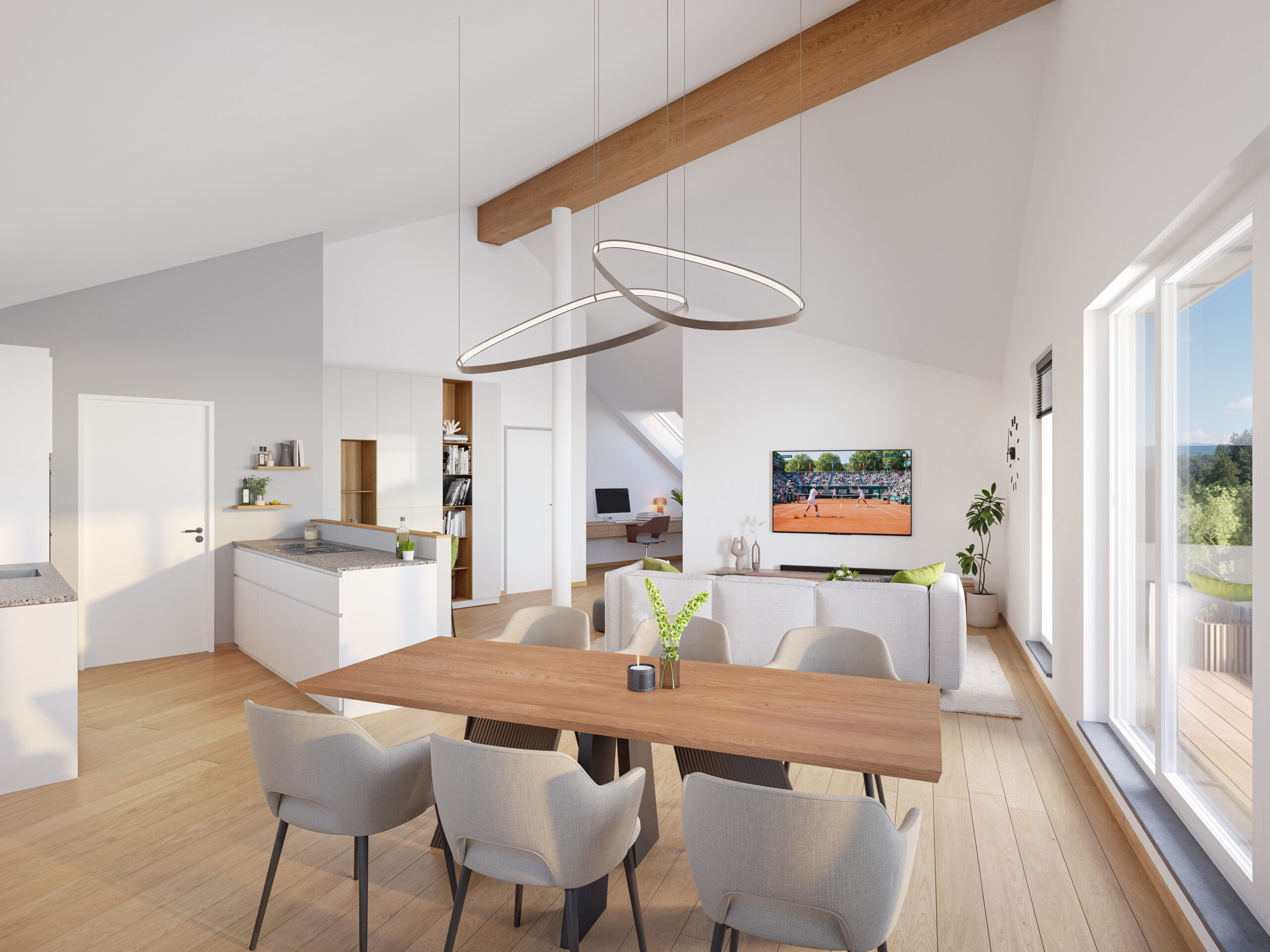 Im Fokus stehen Energieeffizienz und Wohnkomfort: Die kollektive Luft/Wasser-Wärmepumpe, individuelle Warmwasser-Microbooster, die moderne Wohnraumlüftung und isolierte Fenster sorgen für ein angenehmes Raumklima bei minimalem Verbrauch.